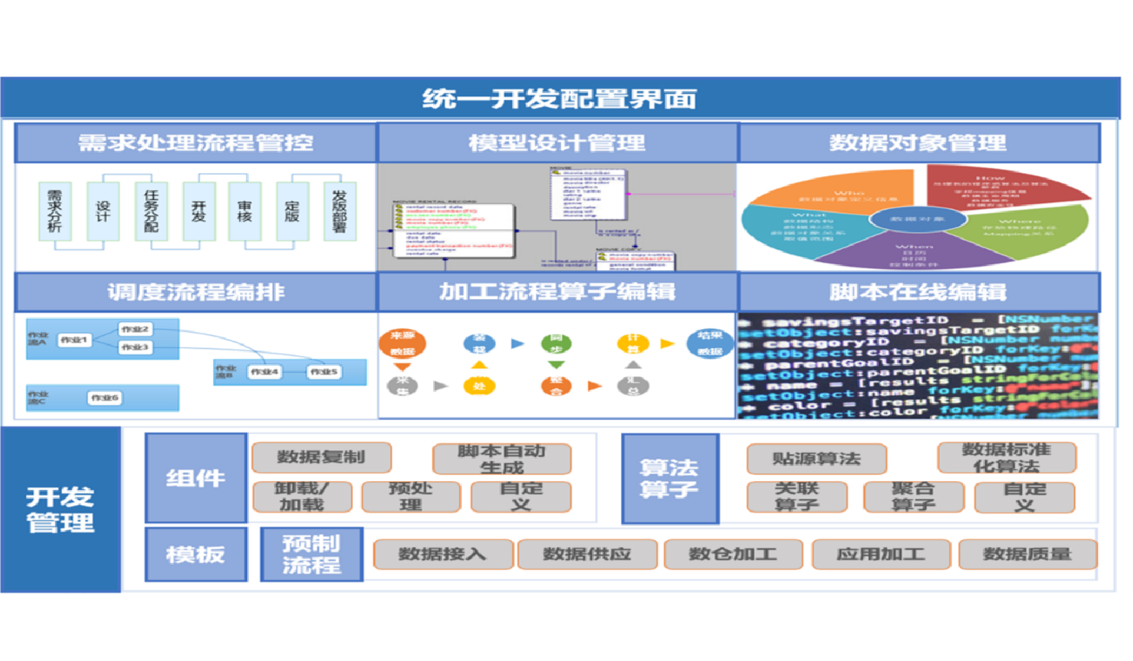 元数据的采集过程、数据变更,数据标准的发布、审批,数据质量的数据检核、问题发现、问题处理,数据治理工作全流程支撑开发